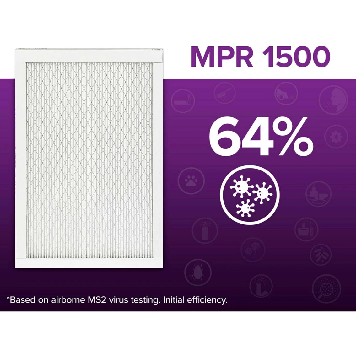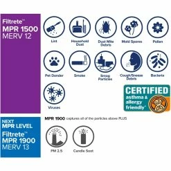 Your home should be your sanctuary, starting with the air you breathe. 3M Filtrete Allergen, Bacteria and Virus Air Filters help capture unwanted particles from your household air, contributing to a cleaner, fresher home environment. By proactively capturing dust, bacteria, viruses and allergens, these high performance filters help improve your homeโs air quality. Designed with Exclusive Filtrete Brand 3-in-1 technology from 3M to trap unwanted air particles while letting cleaner air flow through. Attracts and captures microscopic particles such as smoke, cough and sneeze debris, bacteria and viruses–and large particles, including lint, household dust and pollen. 1500 MPR has a rating of MERV 12. The higher the MPR, the more microparticles–such as pollen, pet dander, smoke, bacteria and viruses–your filter will capture from the air passing through it. 54% small particle capture, like bacteria and particles that carry viruses* (*% captured is based on ASHRAE 52.2 testing for 0.3 to 1 micron particles from the air passing through the filter, which relates to HVAC industry standard efficiency testing). Certified as asthma & allergy friendly (*As outlined in report ASCR: 1246-01). FIND YOUR SIZE: 1500 MPR available in 4 in., 4 in. slim fit and 5 in. thick air filters. For optimal performance of your heating and cooling system or HVAC system, change your home air filter at least every 90 days for 1in. filters and at least every 12 months for 4 in. and 5 in. filters. A dirty filter will slow down air flow and make the system work harder to keep you warm or cool–wasting energy. Sign-up for a filter change reminder program (www.filtrete.com/ChangeReminders) that works for you! For Residential use only.