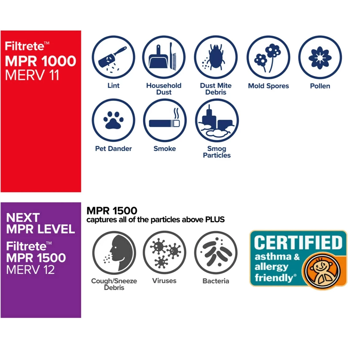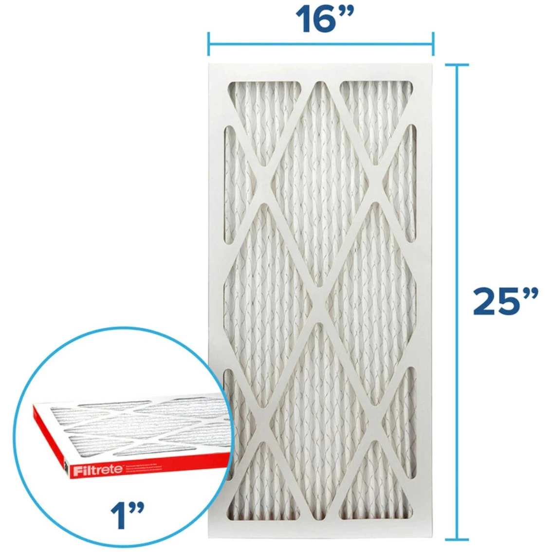 Filtrete Allergen Defense Air Filter, 1000 MPR, 16 x 25 x 1 in., one pk. three-month pleated 1 in. home air filters for your furnace, air conditioner or HVAC system. Designed with the exclusive Filtrete brand 3-in-1 technology from 3M to trap unwanted air particles while letting cleaner air flow through. Attracts and captures particles such as lint, pollen, dust, pet dander, smoke and smog. 1000 MPR has a rating of MERV 11. The higher the MPR, the more microparticles–such as pollen, smoke, bacteria and viruses–your filter will capture from the air passing through it. For optimal performance of your heating and cooling system or HVAC system, change your home air filter at least every 90 days for 1 in. filters, and at least every 12 months for 4 in. and 5 in. filters. A dirty filter will slow down air flow and make the system work harder to keep you warm or cool–wasting energy.