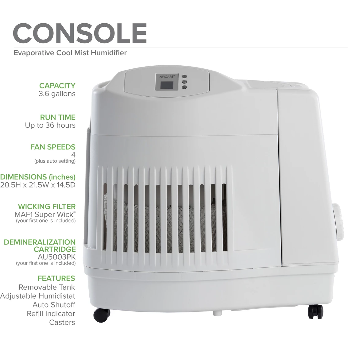 This Aircare Console Evaporative Humidifier for 3600 sq. ft. has a 3.6-gal. water capacity and runs up to 36 hours per filling. Aircare humidifiers are made to look great in any room, in any home. But they’re more than just good looks. Aircare humidifiers really care for your air. Whether you need a cool mist evaporative humidifier for your whole house, a warm mist ultrasonic humidifier for your baby’s nursery, or a steam humidifier to help soothe flu symptoms, Aircare has a humidifier with the right mist to keep you comfortable. Model: MA1201.