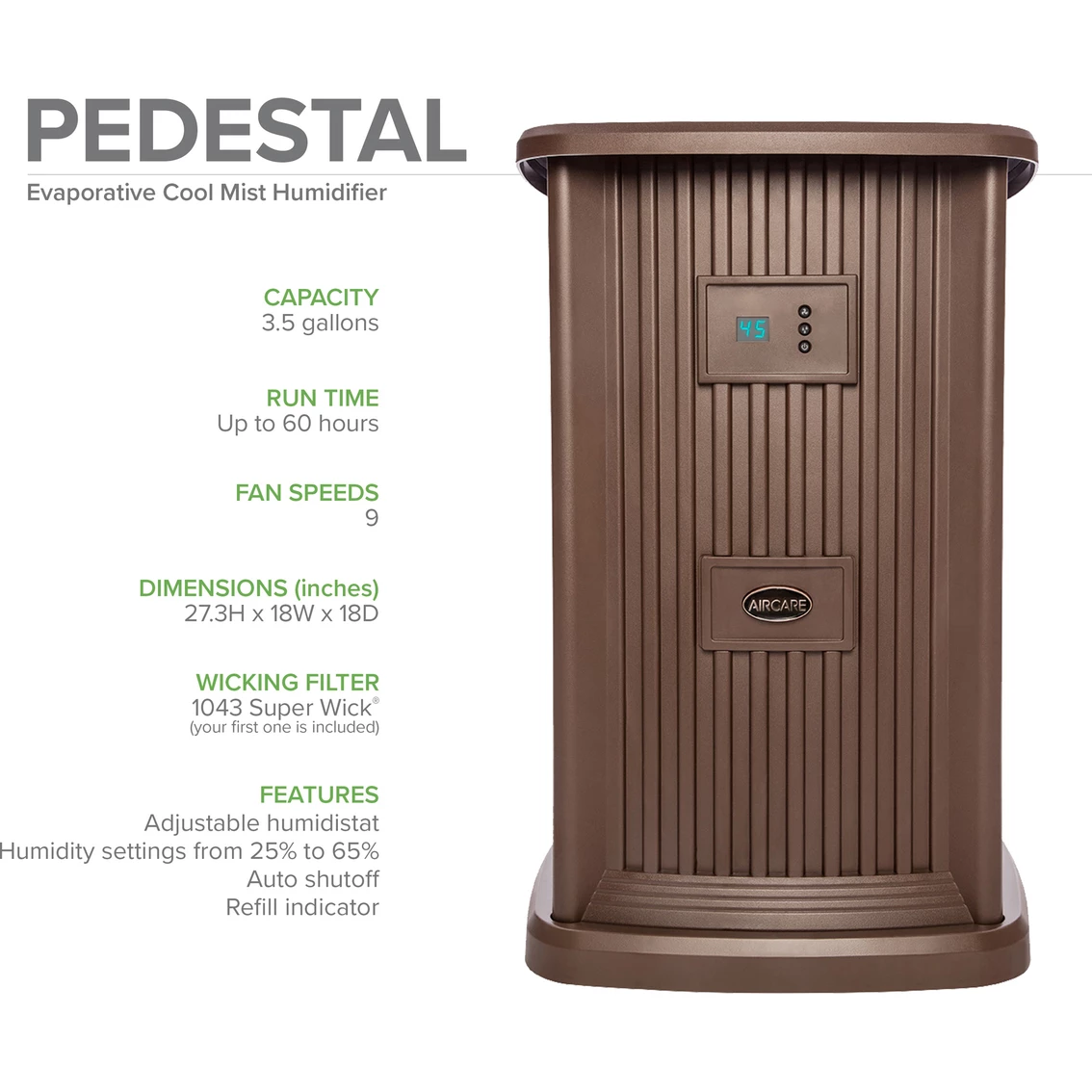 The Aircare Pedestal Evaporative Humidifier in Nutmeg has a 3.5-gal. water capacity, covering up to 2400 sq. ft. and runs up to 60 hours per filling. Aircare humidifiers are made to look great in any room, in any home. But they’re more than just good looks. Aircare humidifiers really care for your air. Whether you need a cool mist evaporative humidifier for your whole house, a warm mist ultrasonic humidifier for your baby’s nursery, or a steam humidifier to help soothe flu symptoms, Aircare has a humidifier with the right mist to keep you comfortable. Model: EP9 500.
