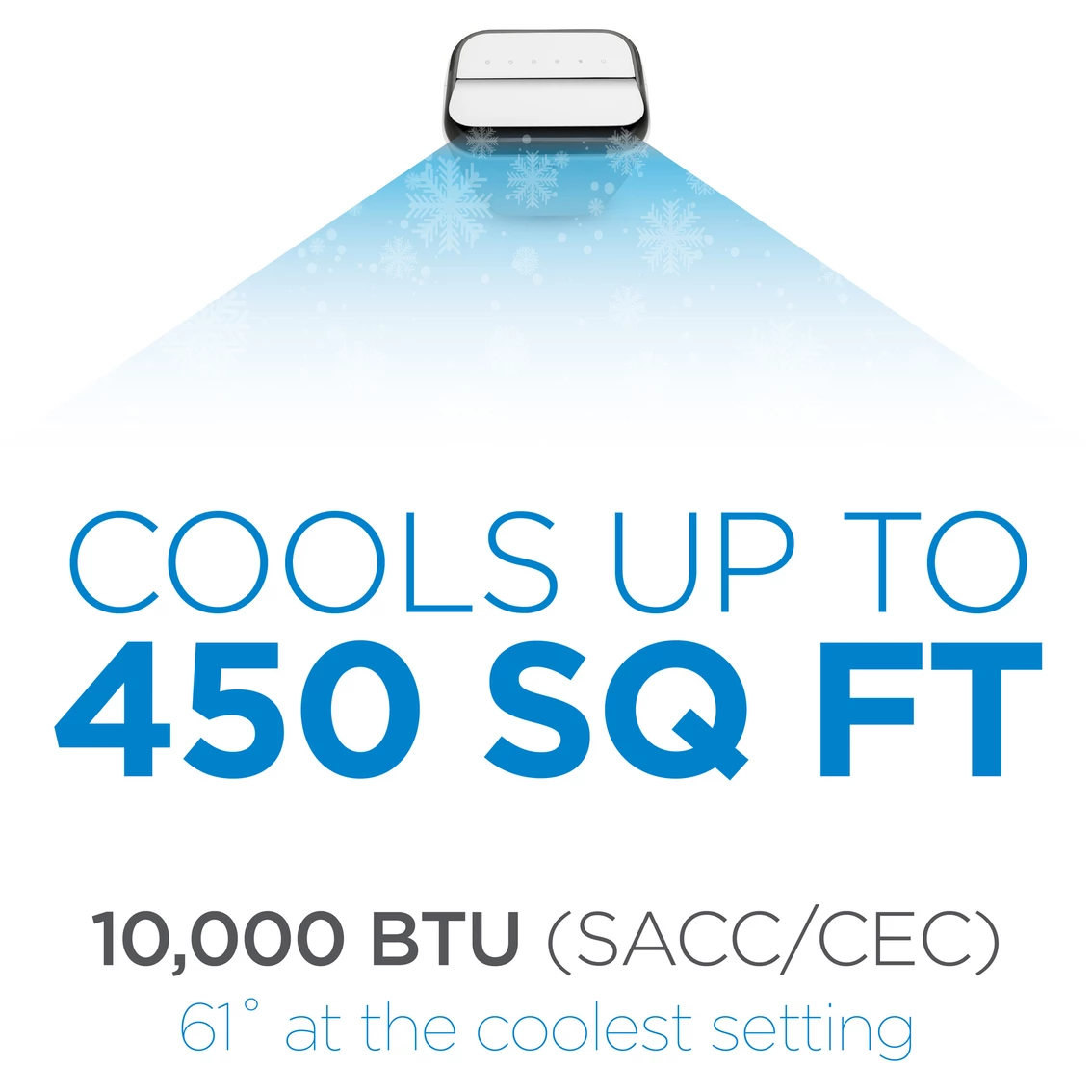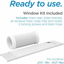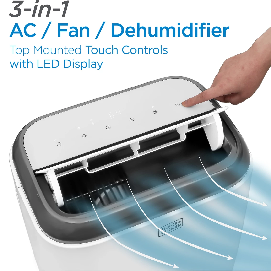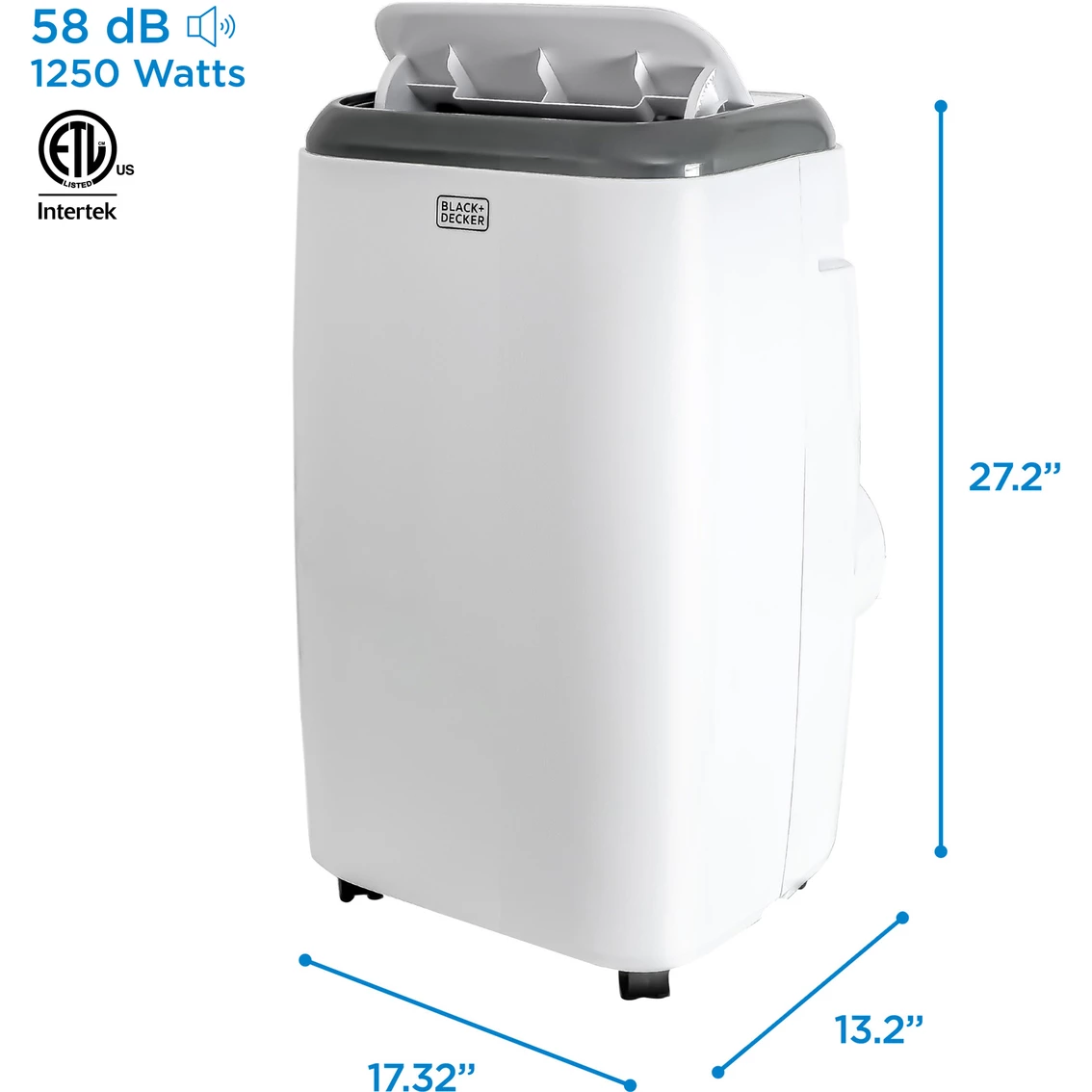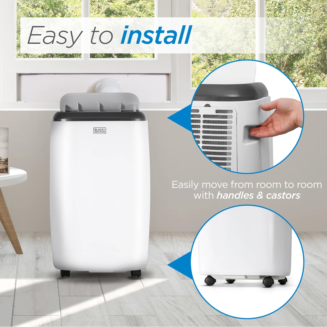 Keep your living room, bedroom, office, camper, apartment, cabin, or dorm comfortably cool with this flexible Black + Decker Portable Air Conditioner with remote (10,000 BTU SACC/CEC) (14,000 BTU ASHRAE). The ETL safety certified air conditioner was engineered for rapid cooling to temperatures as low as 61 degrees F while dehumidifying up to 90 pints every 24 hours. Quick set up is made possible with the window kit, which includes an air slider bracket, hose inlet and outlet, two locking screws, foam seal, exhaust hose, and drain hose. Circulate air throughout your space with the help of an auto air swing mode and pick between three cooling speeds — 166 cfm at low, 178 cfm at medium, and 202 cfm at high. The Portable Air Conditioner works in almost any space up to 450 sq. ft. or smaller while its four rolling wheels and easy-to-maneuver size allow for low-hassle mobility. Use only in double hung windows or sliding windows only, not crank windows. Be sure to place the unit on a level, smooth floor that is strong enough to hold its weight for low noise and vibration while in operation. Completely close all doors and windows when in use for best circulation, connect the included hoses to make sure the unit functions properly, and note that there will be a three minute delay before the compressor begins cooling air after settings have been changed on the microprocessor. The air conditioner remote requires two AAA batteries (sold separately).