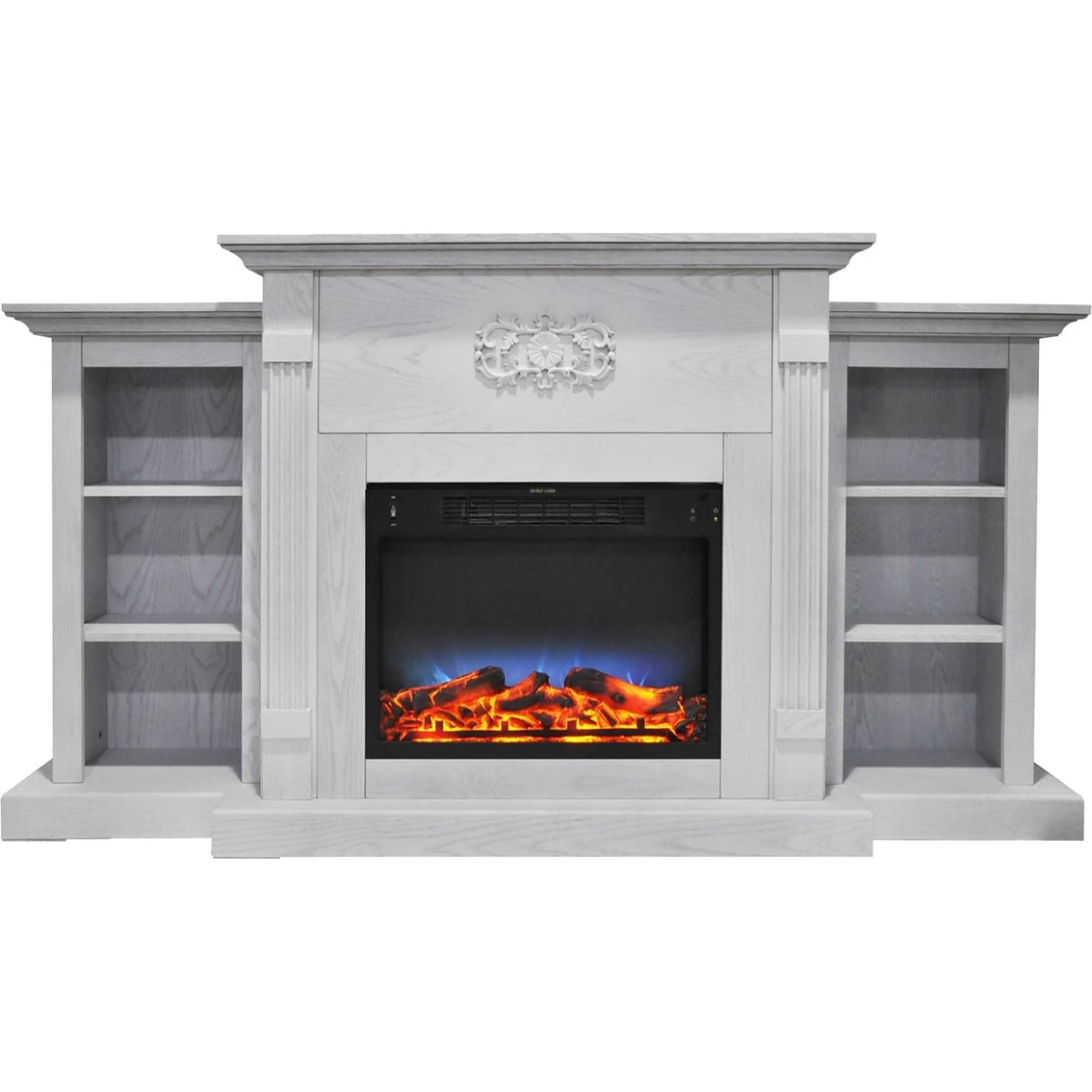 Electric fireplaces are an easy way to add warmth and character to your home. If you are looking for an multi-functional statement piece, the Cambridge Sanoma 72 In. Electric Fireplace in White with Built-in Bookshelves and a Multi-Color LED Flame Display is perfect for you. Two side bookshelves balance the middle frame that hosts the fireplace insert. These shelves, along with the long mantel top, provide plenty of space for displaying books and decor. A Gothic floral applique is carved across the top of the fake fireplace, giving it a classic and traditional look. The clean lines, fluted pilasters, and crown molding are a few of the design details that add even more character to the frame. The multi-color LED insert produces 5,115 BTUs of fan-forced heat that quickly warms a 210 sq. ft. room. A color-changing flame display dances across the back of the firebox, creating movement that is sure to catch your eye. Embers of light glaze across the logs within, adding more depth to the realistic log display. Model: CAM7233-1WHTLED.