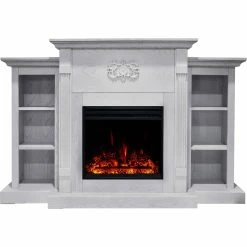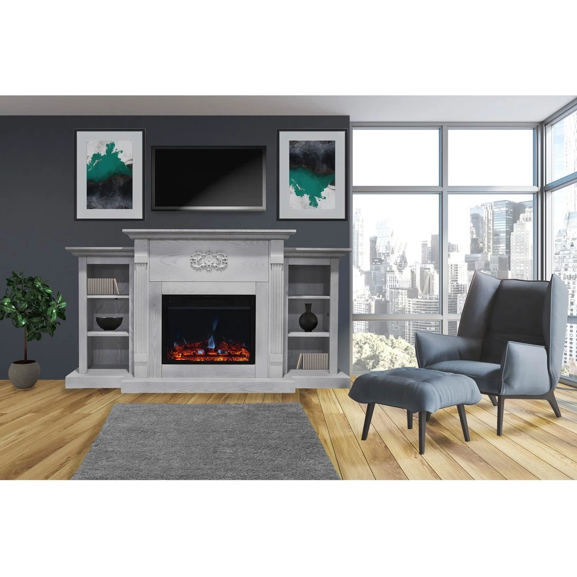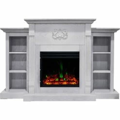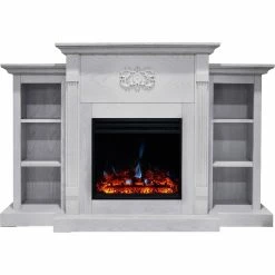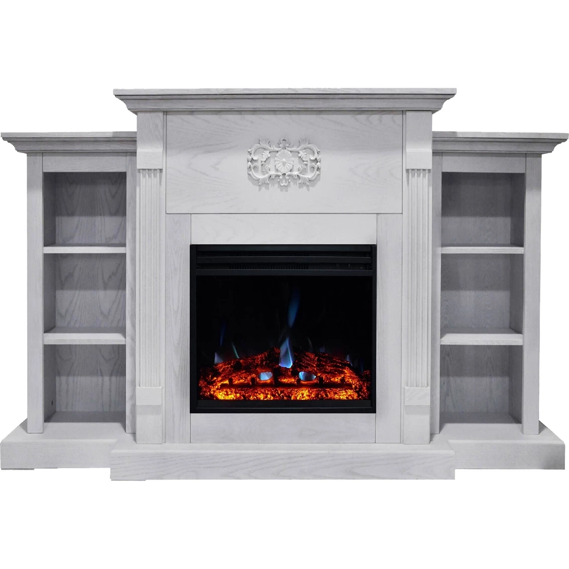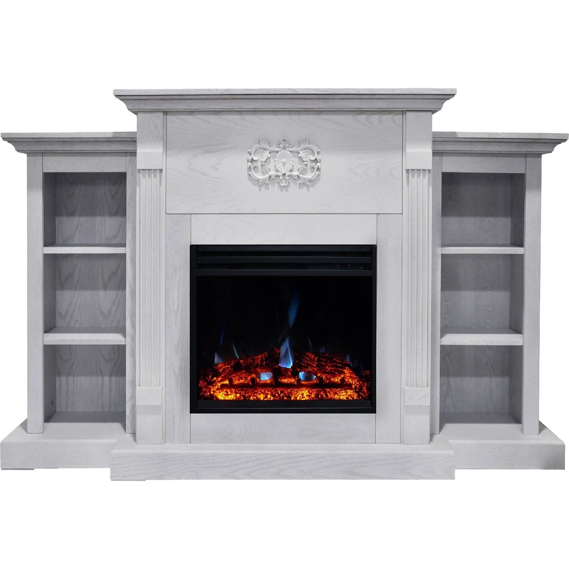 Electric fireplaces are an easy way to add warmth and character to your home. If you are looking for a multi-functional statement piece, the Cambridge Sanoma Electric Fireplace Heater with 72-In. White Mantel, Bookshelves, Enhanced Multi-Color Log Display and Remote is perfect for you. Two side bookshelves balance the middle frame that hosts the fireplace insert. These shelves, along with the long mantel top, provide plenty of space for displaying books and decor. A Gothic floral applique is carved across the top of the fireplace, giving it a classic and traditional look. The clean lines, fluted pilasters, and crown molding are a few of the design details that add even more character to the frame. The electric insert produces 5,115 BTUs of fan-forced heat that can quickly heat a 210 sq. ft. room. An enchanting LED flame display dances across the back of the firebox, creating movement that is sure to catch your eye. Embers of multi-color light glaze across the logs within, adding highlights throughout the enhanced log display. Model: CAM7233-1WHTLG3.