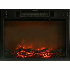 - Fireplace insert operates off of fan-forced air and displays flames across a bed of charred logs