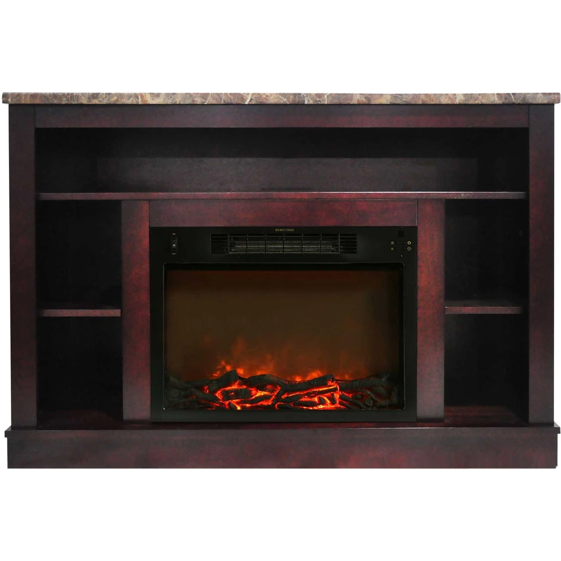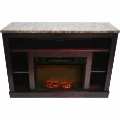 The Seville 47 in. Electric Fireplace Heater from Cambridge offers the perfect blend of style and functionality to any room it’s placed in. The slim frame is made out of sturdy MDF material with a mahogany finish. The clean lines, fluted pilasters and crown molding are a few of the design details that add character to the frame. The multi-color LED insert produces 5,115 BTUs of fan-forced heat that quickly warms a 210 sq. ft. room. An enchanting flame display dances across the back of the firebox, creating movement that is sure to catch your eye. Embers of light glaze across the logs within, adding more depth to the realistic log display. The brightness, flame color and heat settings can be adjusted at the push of a button, and you even have the option to display the flames with or without heat. This makes it perfect for use throughout the year!
