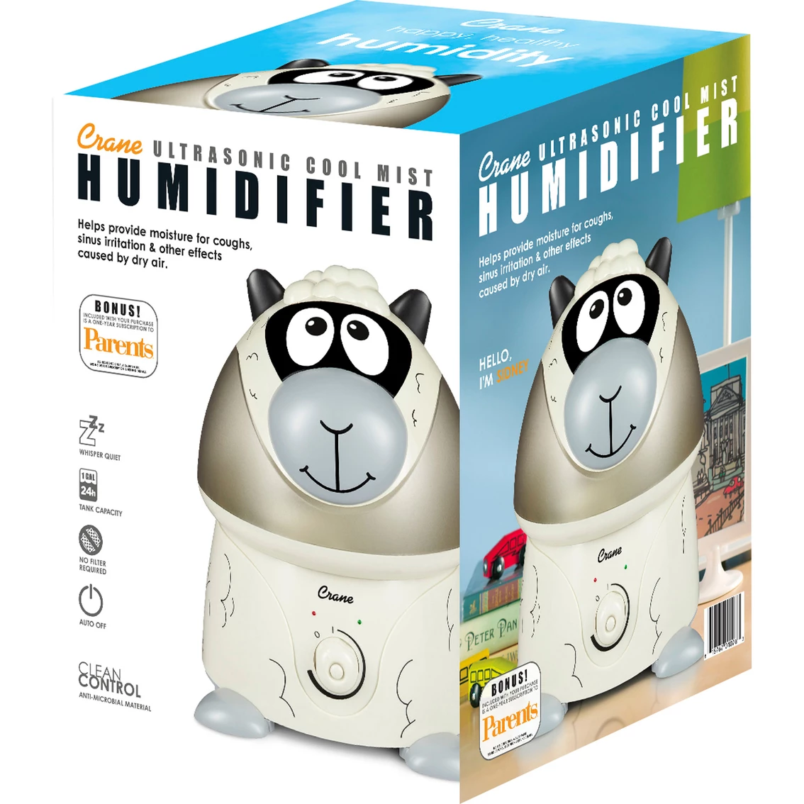 Get relief from cold and flu symptoms and bring wellness to your entire family with a Crane Adorable humidifier. Featuring award winning, child friendly animal designs and top rated performance. Crane’s 1 Gal. Adorable ultrasonic cool mist humidifiers provide up to 500 sq. ft. of coverage and 24 hours of soothing moisture to help relieve the effects of dryness and congestion, helping you and your family to breathe easy and sleep through the night peacefully.