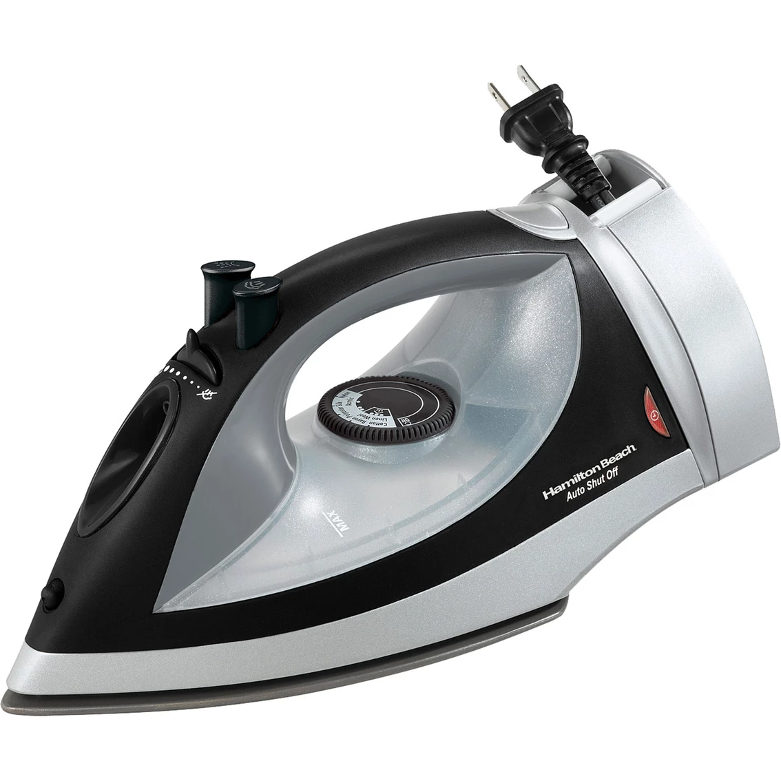 This Hamilton Beach Iron provides powerful steam performance, plus a push button retractable cord that makes storage a snap. Nonstick soleplate glides easily over fabrics and helps prevent starch buildup. Vertical steam quickly smooths clothes while on the hanger. Adjustable steam. Auto shutoff with reset button. Model: 14210.