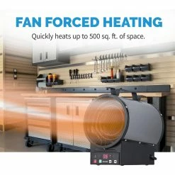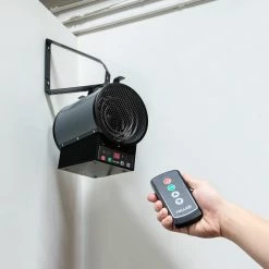 With 4,800 watts of pure heating power, this garage heater keeps your workspace warm all winter long. The 240-volt heater works with a 30-amp outlet and can be mounted to the ceiling, wall, or stand alone on any flat surface for maximum flexibility. Use the remote control to set the digital thermostat or timer and enjoy as the fan-assisted electric heater quickly and evenly warms up to 500 square feet of space. Rugged, heavy-duty construction ideal for garages, workshops and more, Powerful fan pushes 4800 watts of power out to heat 500 square feet, Free stand on a flat surface or use mounting bracket to install on the ceiling or wall, Two fan speeds, timer, and digital temperature controls for customizable comfort, 30-amp heater has 3-prong plug for use in 240-volt outlet.