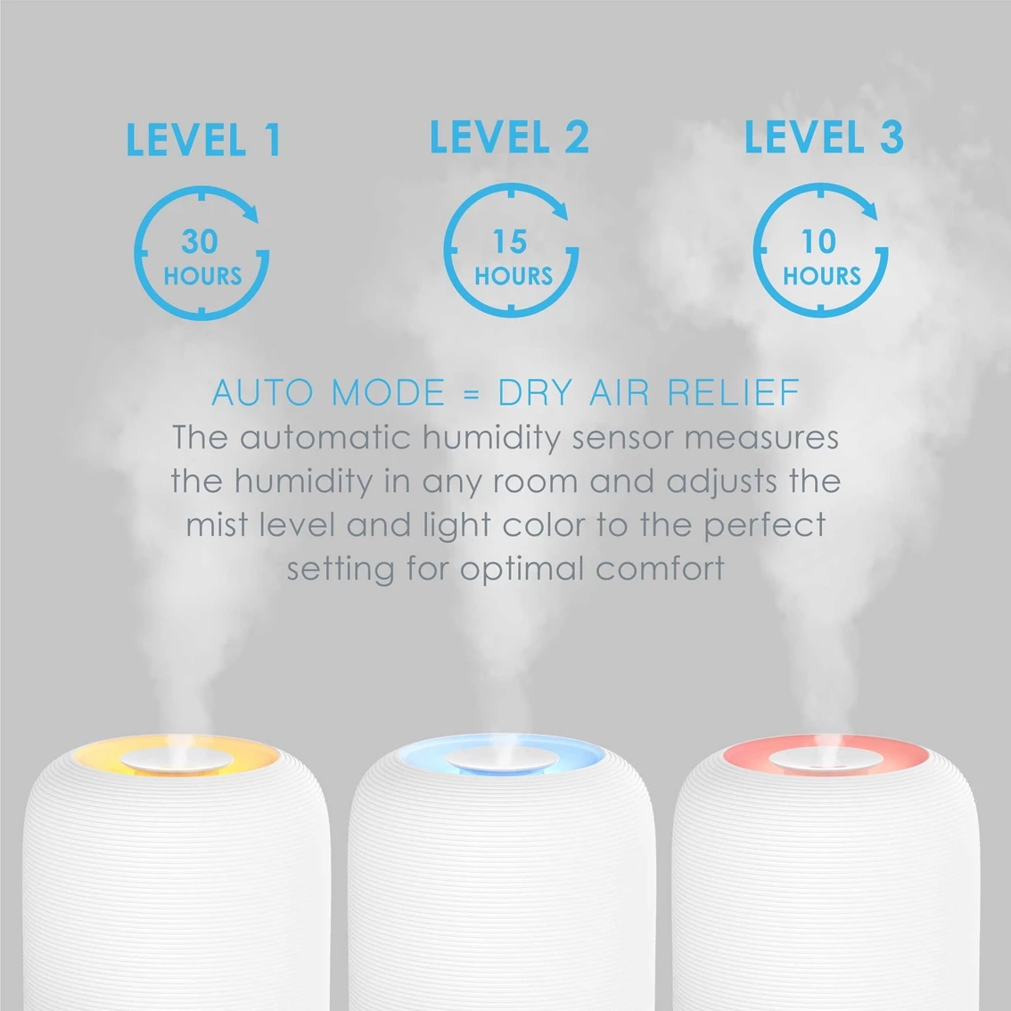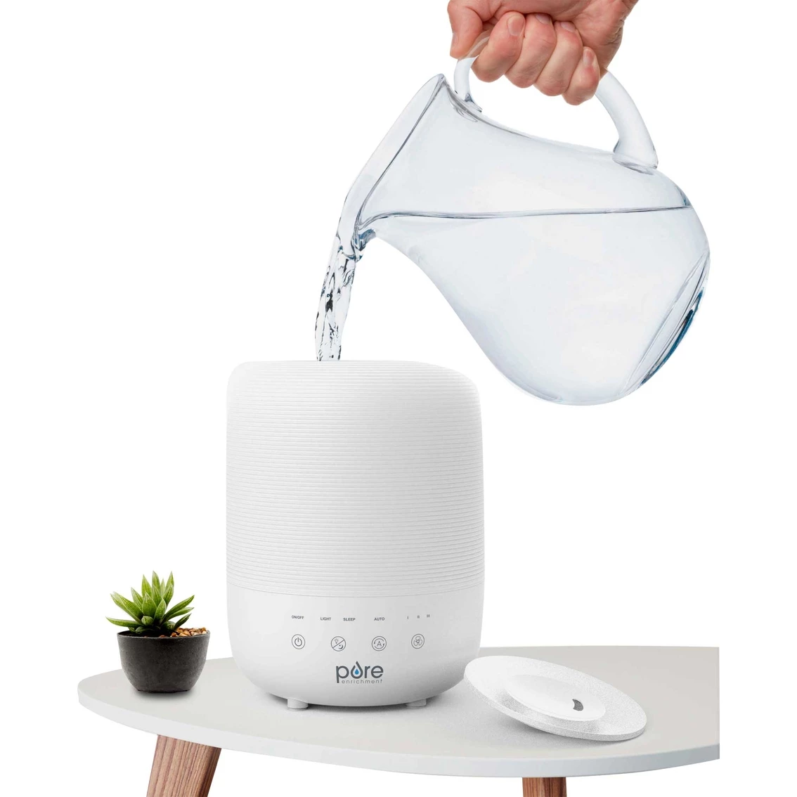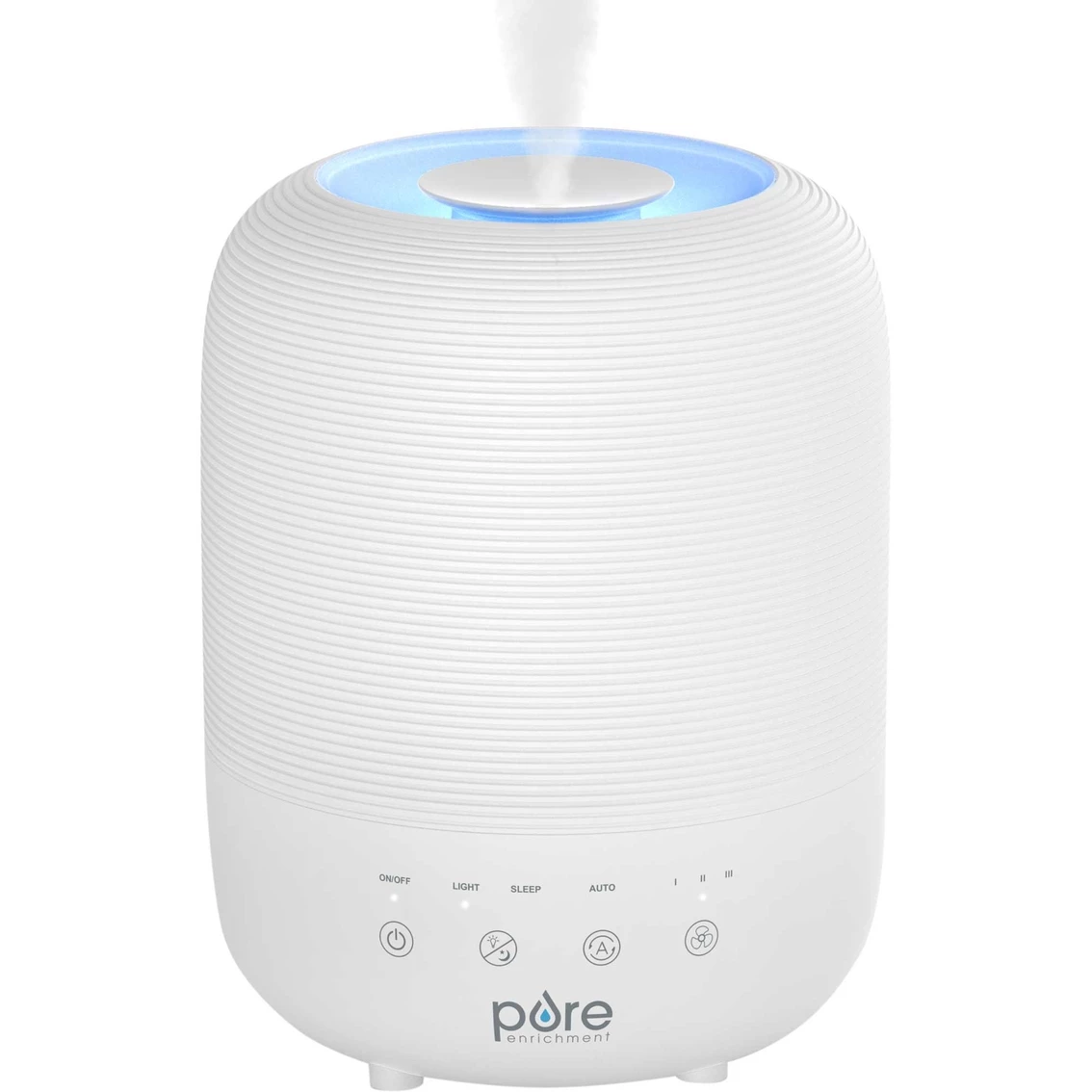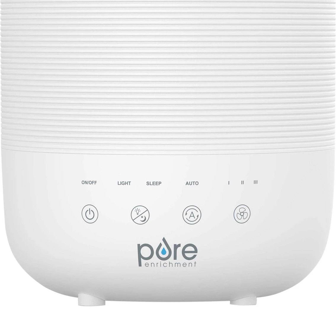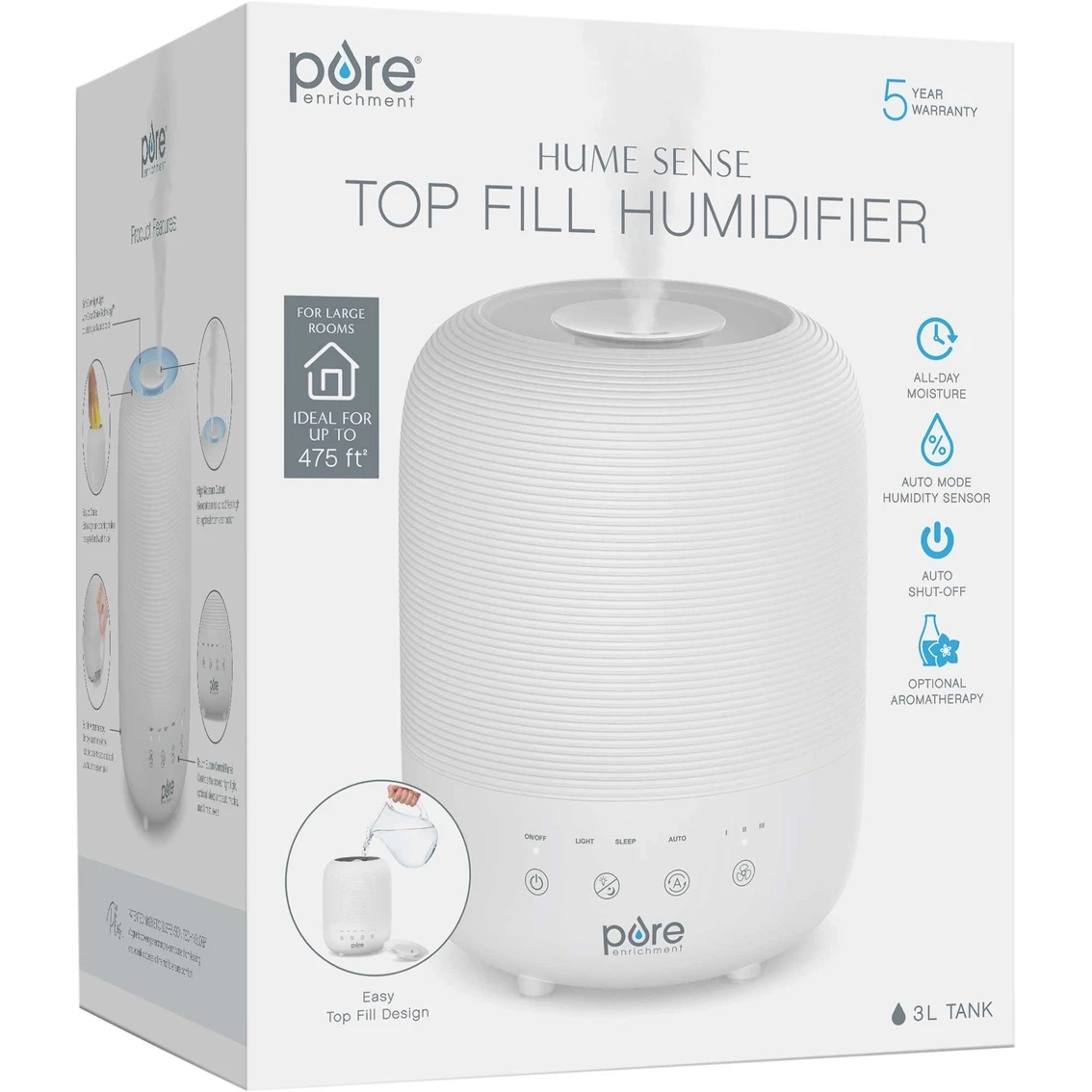 Breathe comfortably and naturally moisturize the air in large rooms with HUME Sense Top Fill Humidifier from Pure Enrichment. Built with convenience and aesthetics in mind, HUME Sense takes the mess out of refills with its true top fill design 3.1-liter tank. The extra wide opening also makes reaching inside to clean the humidifier simple and effortless. Pure Enrichment’s patented magnetic suspension technology uses a magnetic power generator to ensure your humidifier wonβt leak and will evenly disperse a fine mist. Enjoy mist up to 2 feet high at 3 different moisture levels, or use the auto-mode humidity sensor which automatically measures the humidity in the room and adjusts in real-time to provide optimal comfort.