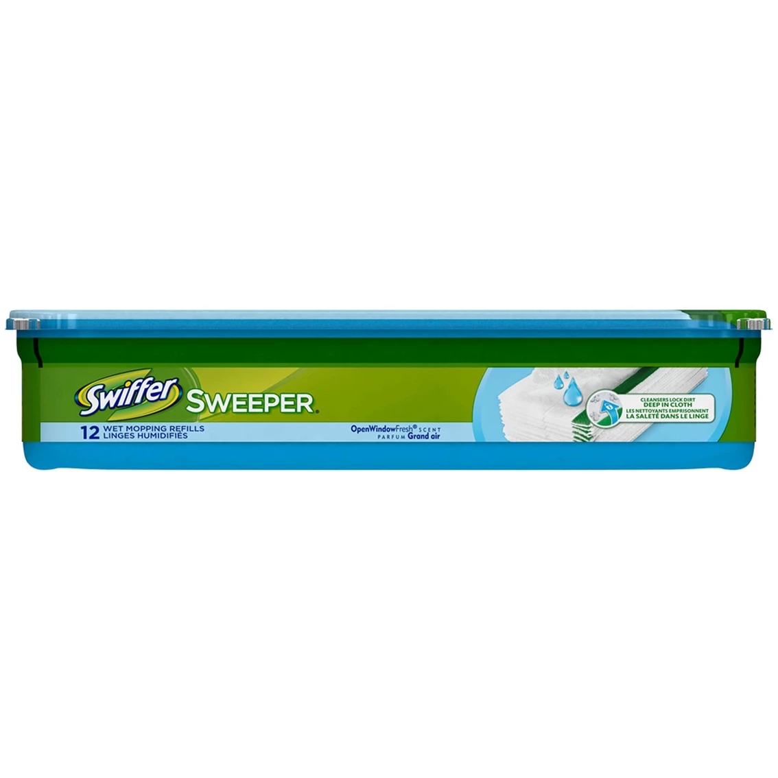 Powerful, unique dirt-dissolving cleansers pull dirt from surfaces and lock it away in these Swiffer Wet Cloth Refills. They feature an Open Window Fresh Scent. Do not use on unfinished, oiled or waxed wooden boards, non-sealed tiles or carpeted floors. Includes 12 wet cloths. Model: 35154.