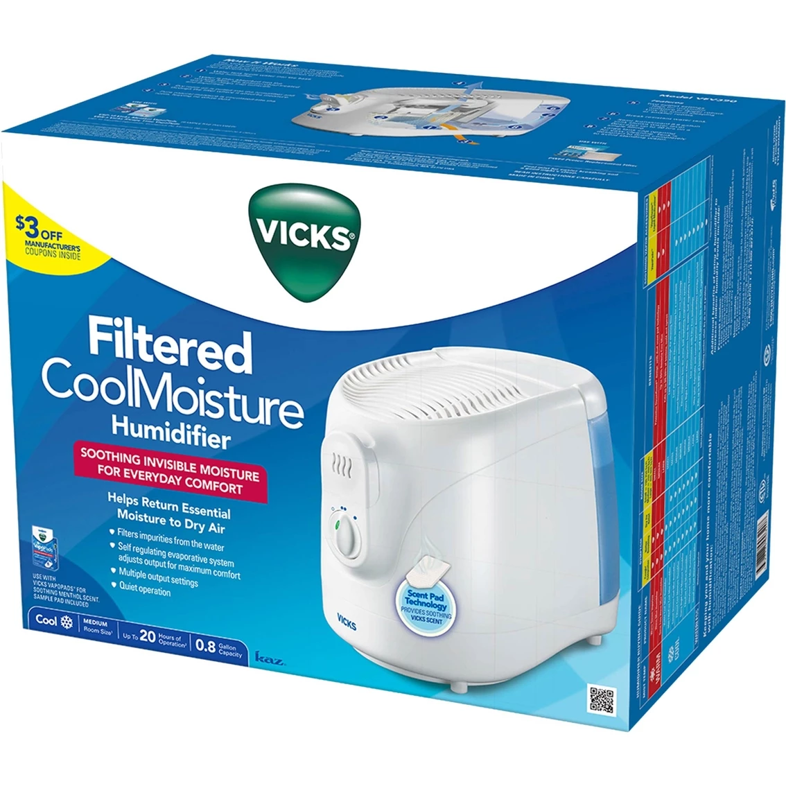 This Vicks filtered cool mist humidifier creates invisible mist. It has two Vicks scent pad slots and a wide tank opening. It is easy to fill and clean with quiet operation. Up to 24 hours per filling. Break-resistant tank. Uses ProTec PWF2 filter and VSP19 Vapo pads. Model: VEV400.