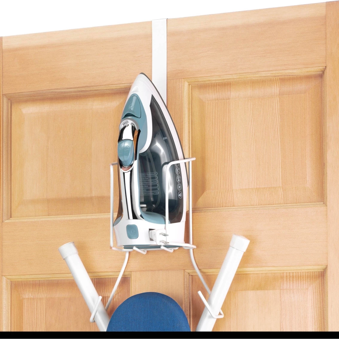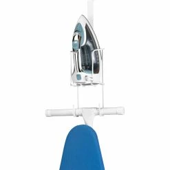 Store your iron and ironing board using this convenient Whitmor Over-the-Door Caddy. Made of durable epoxy coated wire, this caddy can be wall-mounted and can be adjusted to accommodate both T-leg and 4-leg style ironing boards and holds most sizes of irons for easy organization. Model: 6023-5852.