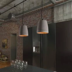 The Zuo Fortune ceiling lamp is made of lightweight faux concrete in a sleek, pint-sized shape. The faux concrete finish is a warm grey tone outside and inside of shade. Install alone for an industrial look for kitchen or bar areas or hang several in restaurants. Suspended wire with black mounting fixture and finished with black electrical cord. UL approved and listed. Requires one size E26, type A19 bulb, max. 60 watts. Bulb sold separately. Model: 50205.